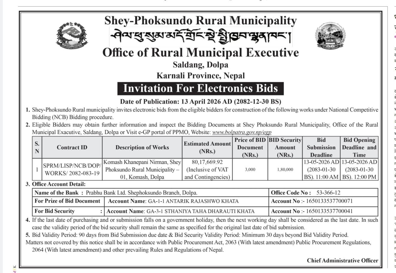 » वोलपत्र आह्वान गरिएको सम्बन्धी सूचना (ठेक्का नं. १९-२०८२-०८३)